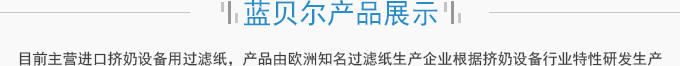 濟(jì)南藍(lán)貝爾工貿(mào)有限公司主要產(chǎn)品擠奶設(shè)備過濾紙,牛奶過濾紙,擠奶機(jī)過濾袋,目前主營進(jìn)口擠奶設(shè)備用過濾紙,產(chǎn)品由歐洲知名過濾紙生產(chǎn)企業(yè)根據(jù)擠奶設(shè)備行業(yè)特性研發(fā)生產(chǎn),產(chǎn)品符合歐盟食品接觸標(biāo)準(zhǔn)及FDA食品接觸標(biāo)準(zhǔn),產(chǎn)品在擠奶設(shè)備過濾紙行業(yè)占有70%以上的份額。并通過了SGS標(biāo)準(zhǔn)技術(shù)檢測中心按國標(biāo)食品級標(biāo)準(zhǔn)進(jìn)行的檢測。產(chǎn)品適用于各種擠奶設(shè)備品牌,本公司目前獲得該區(qū)域產(chǎn)品營銷資格。產(chǎn)品已用于國內(nèi)各大乳企所屬...